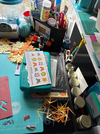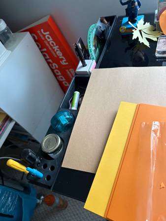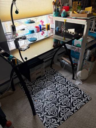 I love this desk and it served me well. It's in good shape. Top is black tempered glass. It has a small 3 drawer cubie under the left side of the desk and 4 on each side for supply storage. It is approx. 40" W with the side cubies. It is sturdy and the glass top does incline.