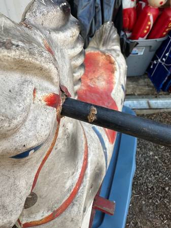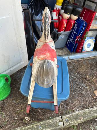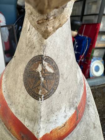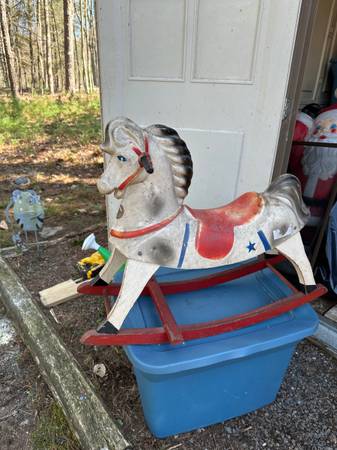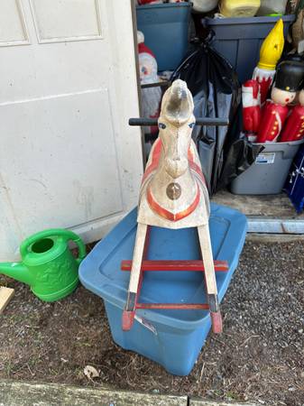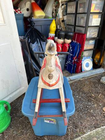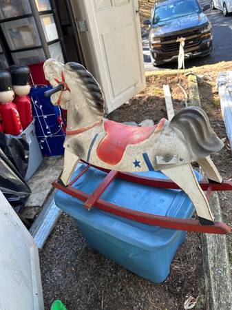 Antique Rocking Horse 🐎 made by Sears and Roebuck USA. Made out of plastic and wood. Don’t know what year but I have it a very long time. Can use some work. Please look at all the pictures. Would be a nice restoration project. They don’t make them like this anymore.