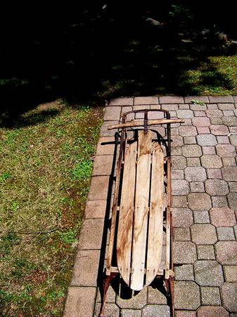 This sled is over 70 yrs old. It needs a bit of TLC. A paint job, a new pull rope and the blades polished, etc. It’s 56 inches long from nose to end of blades and 21 inches across the steering handles. If you don’t want to use it in the snow for fun, hang it up as a decoration.