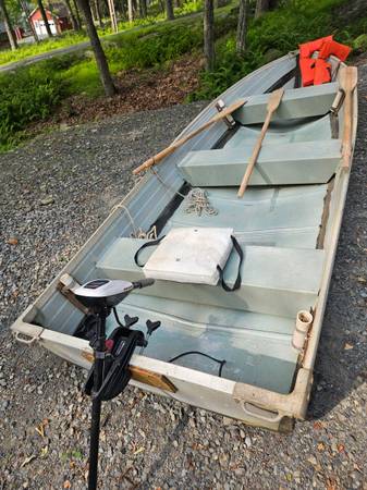 14 ft. Aluminum fishing boat with motor,2 anchors,oars,seat cushion and life vests. Motor barely used. 350.00