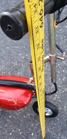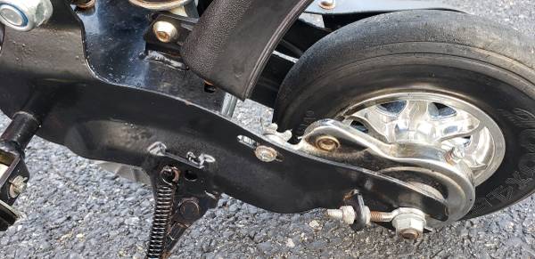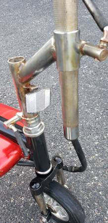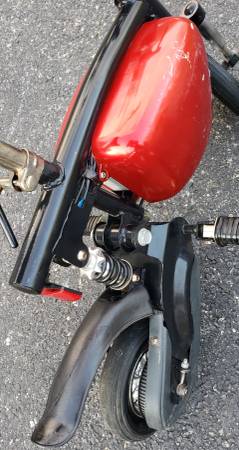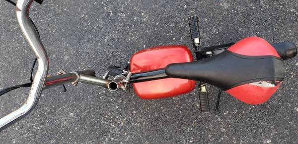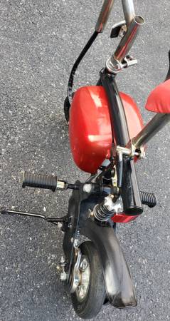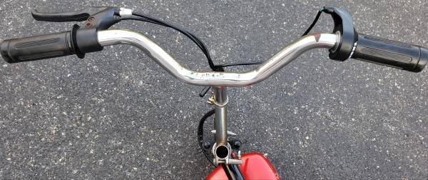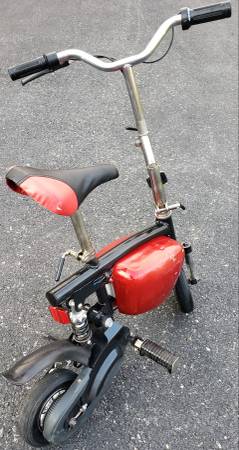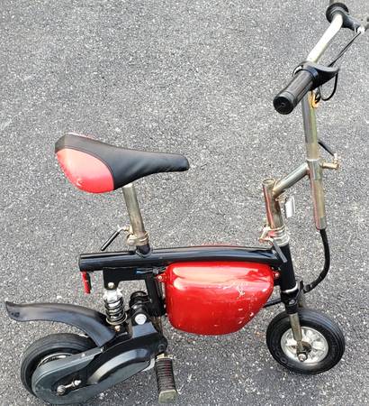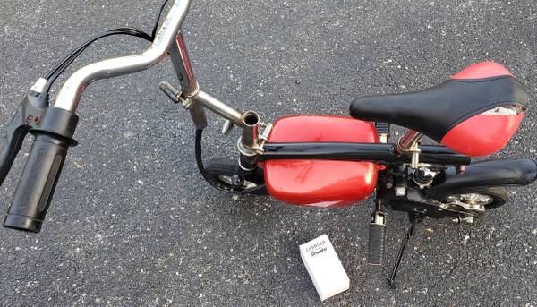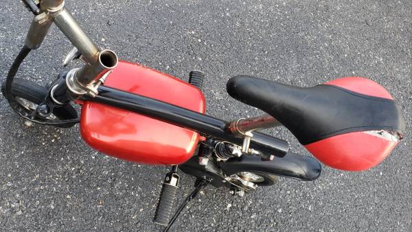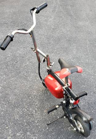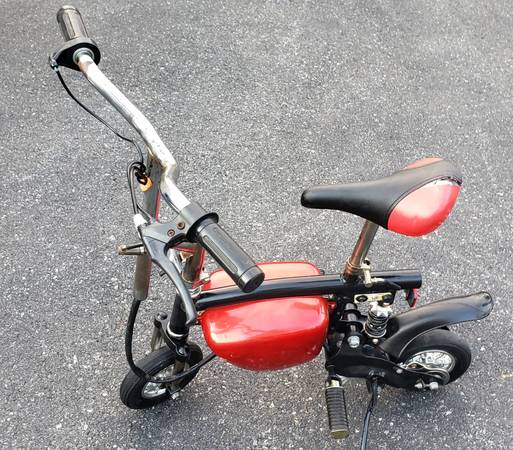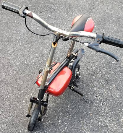 vvery nice electric pocket bike HANDLE BARS AND SEAT HEIGHT BOTH ADJUSTABLE tires are in excellent shape ,a little scrapes on the side battery covers that can be sprayed painted to make it like new again, bike is complete with brake lever with working brake ,bike is in working condition its has a 24 volts electric motor has rear shock ,the batteries do not take a charge so they have to be replaced, it comes with a brand new charger ,it will need a belt for it to drive you can find one on eBay for a few bucks , I HAVE NO THER INFO ON THIS ELECTIC MINI BIKE what you see is what you'll get asking $225 AS IS