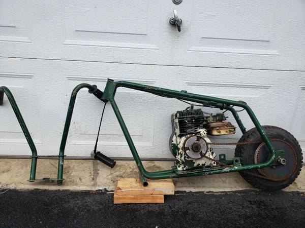 vintage ACME minibike, engine looks to be in tact, missing the small round exhaust and a 5 " gas line from the carburetor to the motor,I put a little gas on the carburetor and it almost started, so motor does run, I see no brakes on this ,minibike will need parts and work to get it running, I power washed it and took some paint of in several areas, looks like it was painted green at one point, you can restore it and paint it any color you want or keep it as is ,the handle bars with the triple tree are just put on for pictures does not have the bolt to hold it in place, the lower forks have broken off as pictured and will not come with it you get wants pictured ,throttle cable is intact and connected to the motor,rear tire is good and rolling smoothly ,frame is solid , this is a vintage Acme old school solid collectable minibike that's ready for resotation,a rare find...