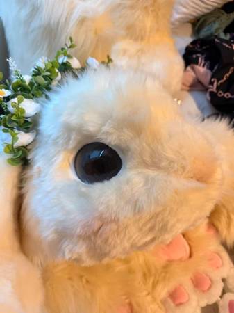 Comes with two sets of fur paws, one white mesh bodysuit, one head+flower crown, one tail with clear belt, one zipper neck fur, and two feet paws. Almost new condition, not used outside of house, in a home with cat+dogs, not been touched by said animals, doesn’t smell of anything, no stains or breakage.