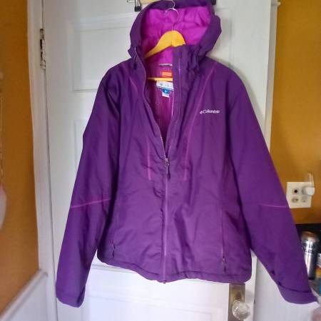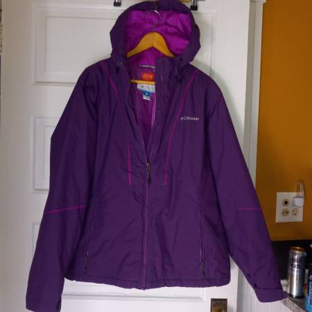 Rich purple with pink Thermal coil insulation. Poly/nylon. XL . hood is sewn in, not zip off
