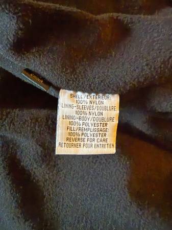 Fleece-lined/Polyester-filled short bomber style jacket. Large velcro closure pocket on inside left and two zippered slant pockets on outside.