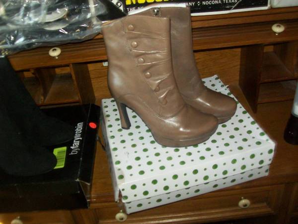 new earthies brown boots, size 9 1/2, womens $5.00, / , new black shoes, 9 1/2, mens, $5.00, , other shoes and boots, $5.00 a pair,pair like new fishing hip boots, size 10, $10.00 call ,