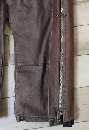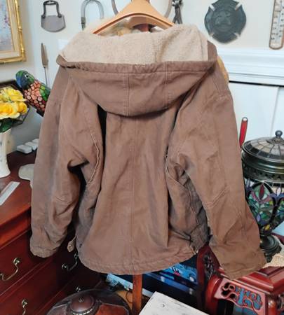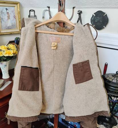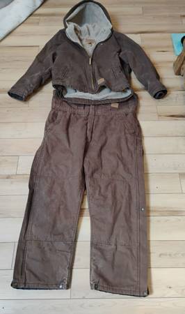 Here is a Nice Matching Pair of Heavy Duty 2 Piece Men's Out Door Work Wear made by Schmidt (like Carhartt) Insulated Jacket and Bibs, lightly Worn in Excellent Condition, Size Extra Large - Regular, Heavy Duty Zippers and Snaps, Medium Brown in Color, 1 - 1/4" hole in sleeve pictured - Extremely Warm