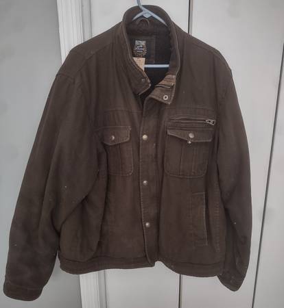 A little light wear on cuffs, but no rips or tears. Jacket has two breast pockets with snap close flaps & one inner Pocket. Has zipper as well as snaps closure on front. Outer shell of Jacket 100% cotton Inner 100% polyester. Machine washable. Size 2 X