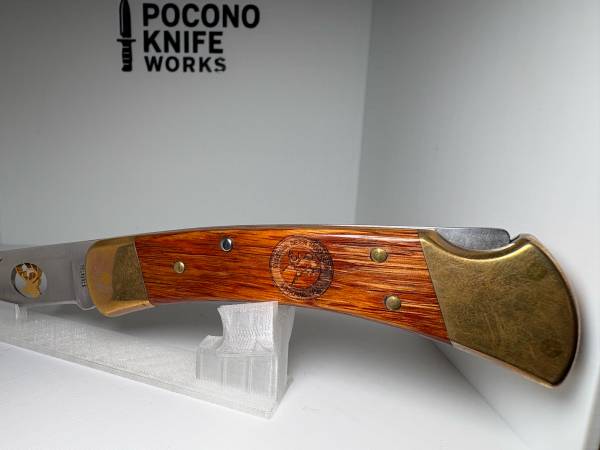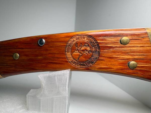 • Buck 110 Folding Hunter – Limited Edition • Etched blade featuring Virginia Deer Hunters Association logo • Serialized: #172 of the run • Brass bolsters with wood inlays, featuring engraved...