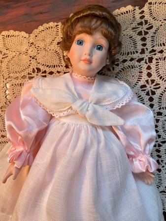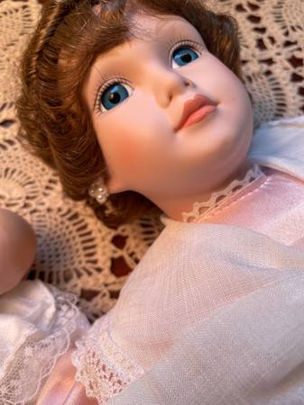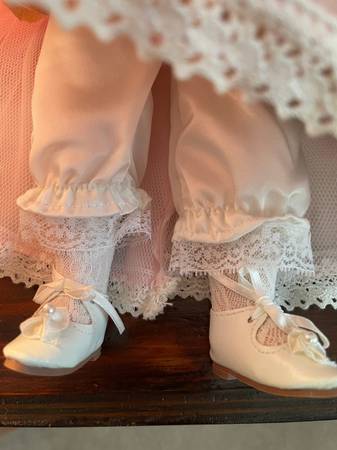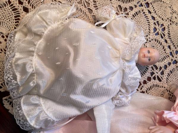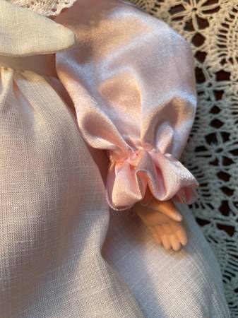 Beautiful silk dress. This doll is new in the original box, comes with another baby doll also dress in pink silk, and lace, she is gorgeous, Would be a lovely gift for Christmas for a person who likes find collectible. Must see to appreciate.