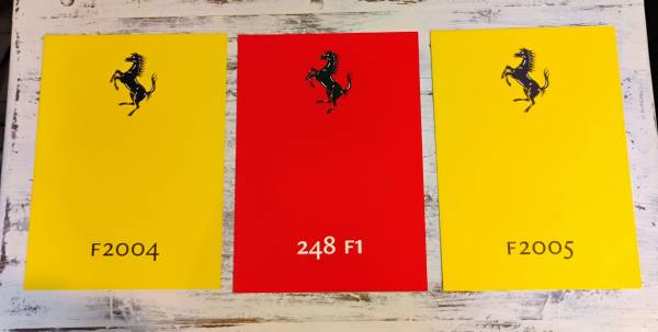 Here are 3 Mint Condition Ferrari Formula 1 Factory Brochures - 2004, 2005, 2006 in English and Italian - Full Specs on Chassis, Carbon Fiber, Gears, Brakes, Suspension, Wheels, Gear Boxes - Engines V/8's V/10 Displacements, Block, Bores, Ignitions, Fuels, Lubricants, Much More, Sponsors, Partners, Bridgestone, Martini, Acer, Shell, Brembo and More - Sent in New Clear Plastic Sleeve with Hard Backing Boards front and back for Protection - Nice Christmas Gift - JIM