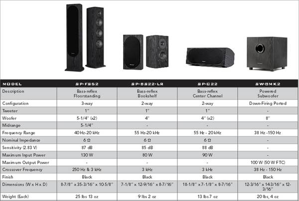 Consists of two towers (SP-FS52), two small bookshelf surrounds speakers (SP-BS22-LR), a center speaker (SP-C22), and a sub (SW-8MK2). I am also selling my stereo for these speakers which is the...