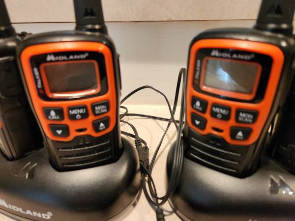 Set of 4 radios that have 22 channels and a range of 23 miles. Come with quad charger and plug. In excellent condition, great for outdoor activities. Local meet only.