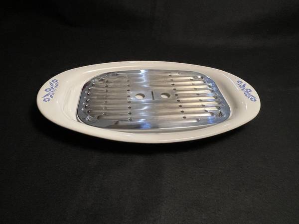 CorningWare Meat Platter with Metal Splatter Shield Blue Cornflower Pattern P-19 Size: 16.5" x 10.25" Like New Made in the USA Smoke free home