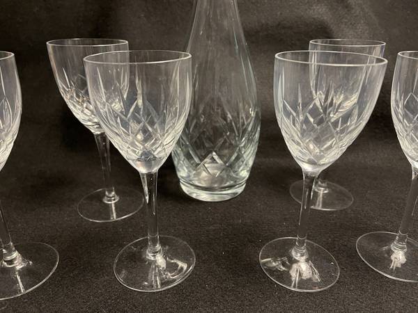 Tall vintage decanter with stopper and set of (6) matching glasses. It is from the late 1960's or early 1970's. It was used once and has been in a China cabinet for over 50 years.