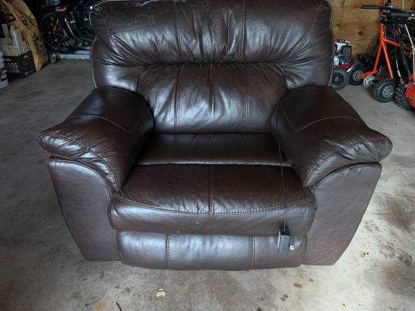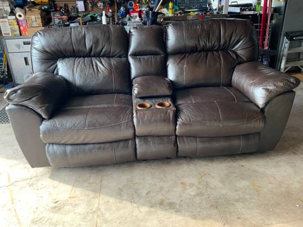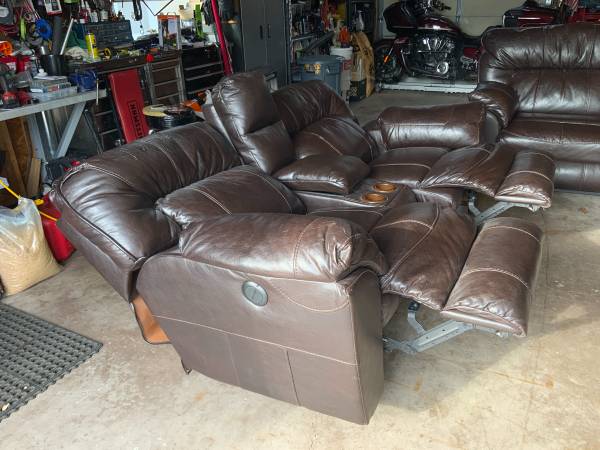Reclining love seat with matching recling chair. These are both wall huggars. Mechanism work like new. Leather is not that great. With a set of slip covers these would be nice. Very confortable.