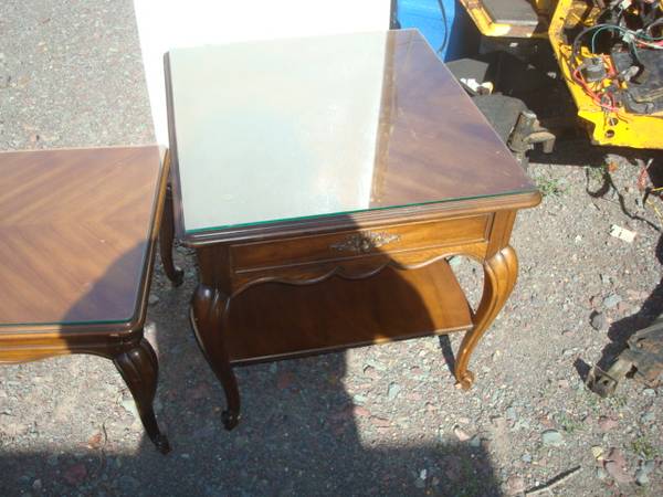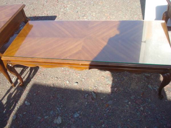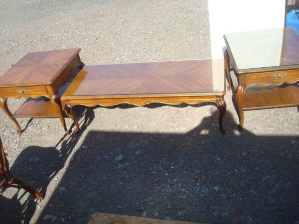 nice 3 pc drexel coffee table, 51 x 22 x 16, w/ glass, 2 end tables, 23 x 27 x 22, 1 w/ glass, 3 for $30.00, call