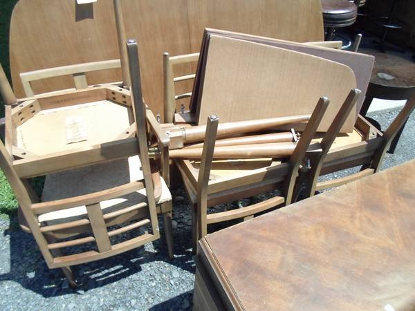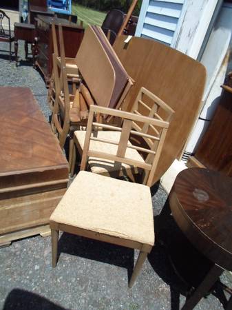 m/ table, 44 x 64 x 30, / table pads, 4 reg chairs, 2 arm chairs, , all solid could be recovered, set for $25.00, call