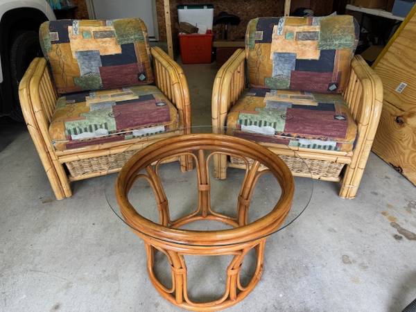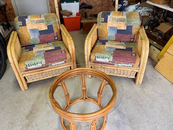 Perfect for Family Room or Den - Set of (2) wicker chairs with glass top coffee table. Table is 18" High, glass top is 28" in Diameter. All are clean and in Very Good condition. Sold as set only....