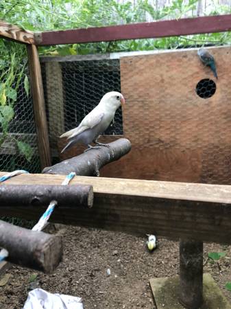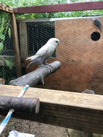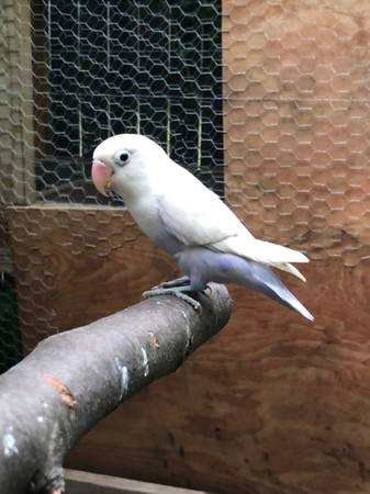 Love bird all white with purple tail ends. Beautiful unique colors. About a 8 months old. Nice bird enjoys being around other love birds. Rehoming fee is 100$ Call me at no emails or texts only...