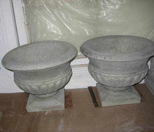 Nice, thick and heavy with drain holes. Classic Style Fancy Cement Planters- 14" W x 11" H. Set of two concrete decorative 4000 psi.( You can find similar sold as antiques) 2025. Empire Junior or Traditional Roman Style.Like your parents or grandparents home you may have seen.See image for size info. Response time may be delayed as see email on PC only. 43.2 lbs. each. . Cavity size shown included in last pic.Also have 2 large Roman Jr. Planters see last 4 images for size is 58lbs. 14.5 W x 13.25 H. first images are empire later images are Roman. Have 2 of each - 100 pair. expect to pay this price for just one elsewheres.
