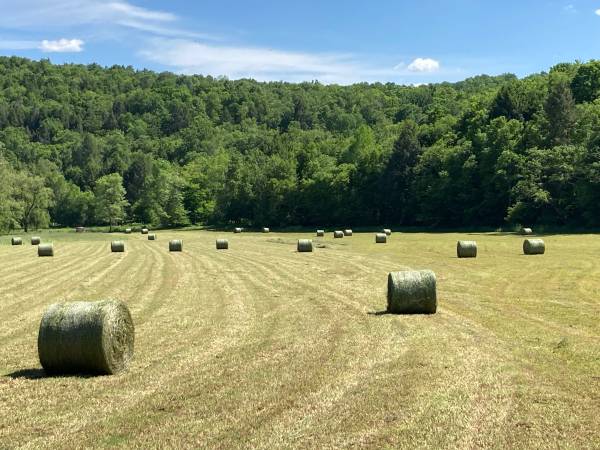 1st cutting dry hay round bales 4 x 4.5 of Timothy and orchard grass. We have 2025 1st cutting available. We have over 50 years of farming experience. Great for horses, sheep, goats, dairy and beef...