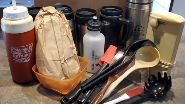 There are 4 coffee mugs, a brushed stainless Ducks Unlimited thermos, a brushed stainless carafe, a couple of water bottles, various utensils, a Hamilton Beach can opener, a butter dish, and in the bag is a set of stainless flatware (knives, forks, spoons).