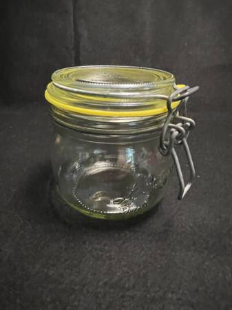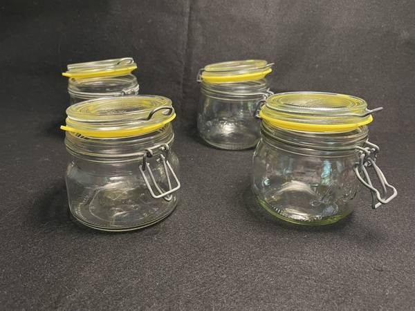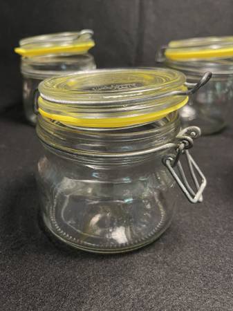 Clamp Jars (set of 4) with Brand New Yellow Silicone Rings. Two jars are from Italy and two are from France. Each jar holds 16ozs and are heavy weight jars. Smoke Free Home