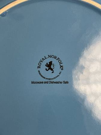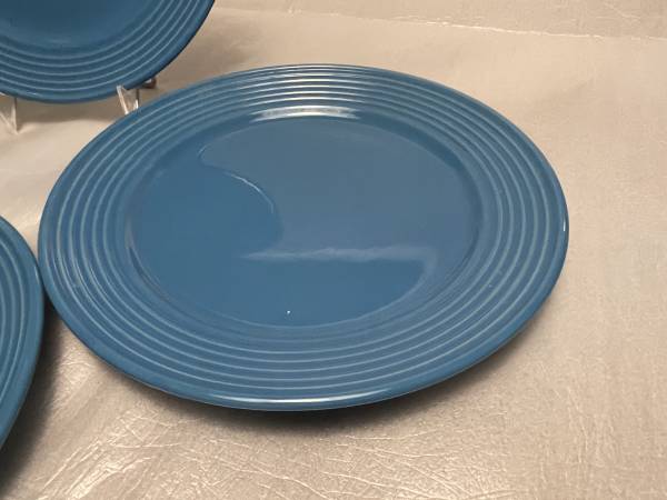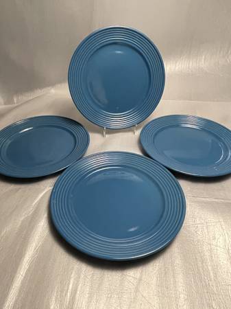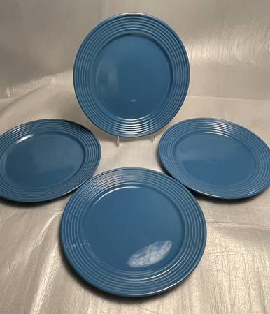 Set of (4) Royal Norfolk Blue Ribbed Rim Dinner Plates 10.5" These are similar looking to Fiestaware. Smoke Free Home