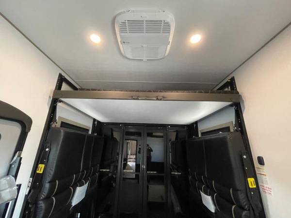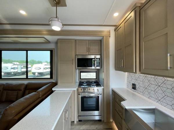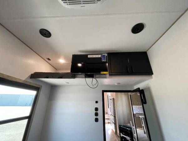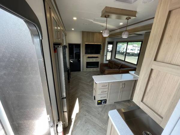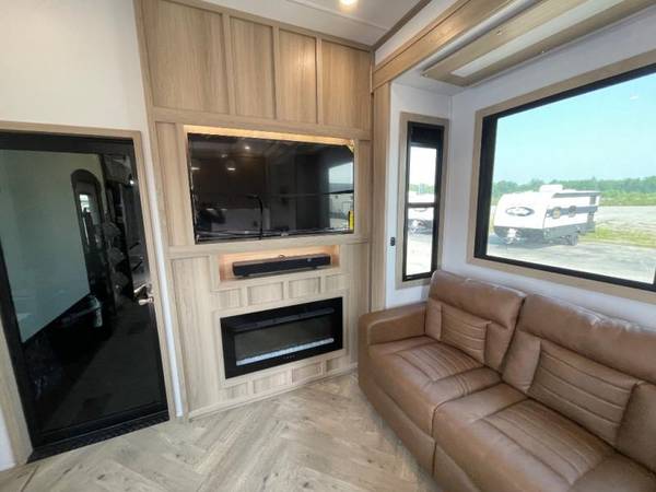 The whole family will love camping in this fifth wheel toy hauler! The front private bedroom has a king bed slide for more interior space, a Smart LED TV, a front large wardrobe, plus washer and dryer prep. Freshen up each morning in the full bathroom with the fiberglass one-piece shower then head to the kitchen to fry up some eggs on the four burner Lusso range and bake some cinnamon rolls in the 24" stainless steel oven. Grab a cold cup of orange juice from the 20 cu. ft. 12 volt refrigerator and enjoy it along with the eggs at the dinette table or in the 14' garage on one of the dual opposing sofas with cupholders. The L-shaped hide-a-bed sofa is conveniently across from the entertainment center with a 50" Smart LED TV and fireplace. As you head into the 14' garage area, you will notice a HappiJac bed with a 32" x 74" mattress, a queen bed above the opposing sofas, Raptor exclusive frame welded tie downs, and one of the dual entry doors to the unit!