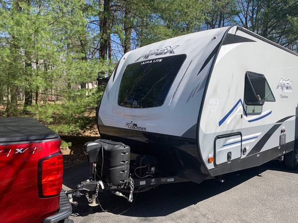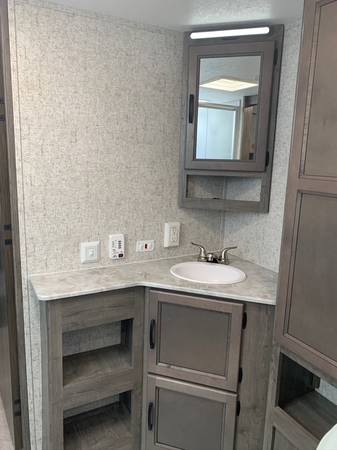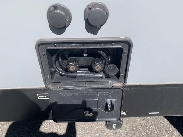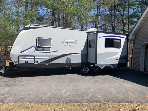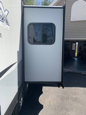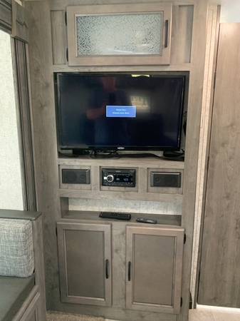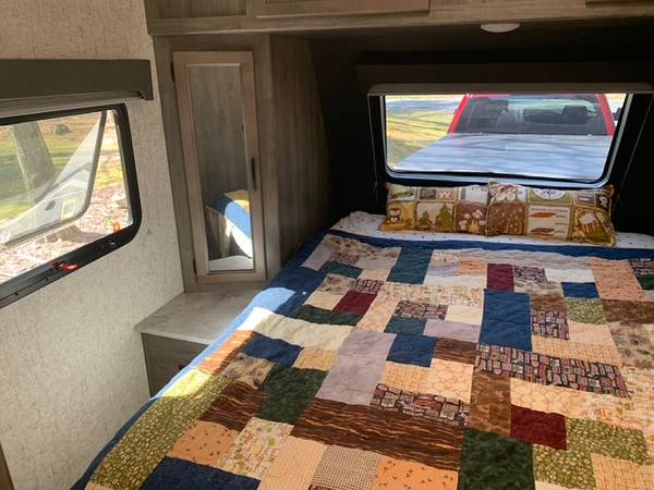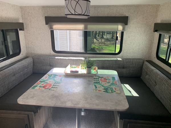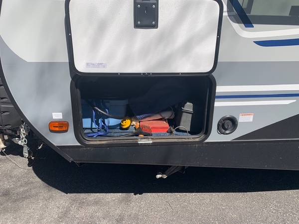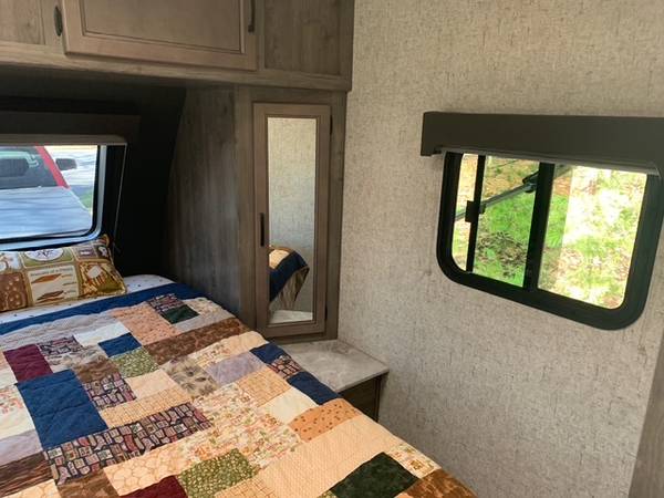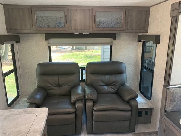 Perfect camper for a couple, or a couple with small child. Sleep 3-4. Rear living with 2 very comfortable recliners at the back. Full size queen in bedroom. Dinette folds down to a bed. About 1000 miles on it. Everything in perfect working order. I have more pictures on request. Roof cleaned and sealed 8/25. New Battery 8/25 Have all original paperwork that came with it. Comes with hitch and weight distribution system. Dry weight 5400.Also includes all pots, pans, dishes, sewer hoses, water hoses and more. Hitch weight 500. About 30 ft total length. TITLE IN HAND. This is a must see.