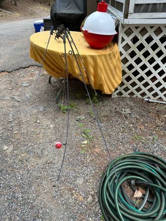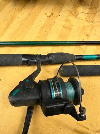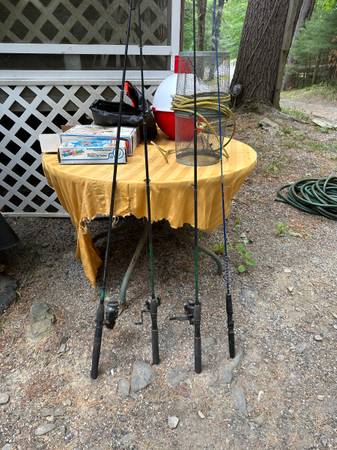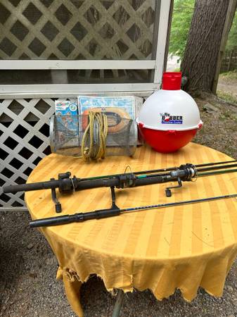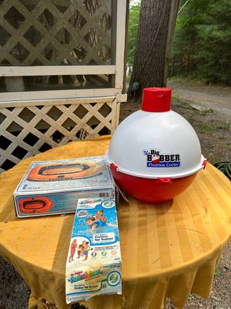 4-Fishing poles, 3-Reels, The big Bobber floating cooler, one raft , one kids swim tot trainer , one I think kelly net. The cooler, raft, and kids swim are all new , the outer boxes are ruff. Fishing poles and reels 🎣 I don’t know about. They all seem good. $30.00 for all. Please look at the pictures.