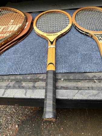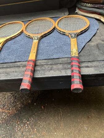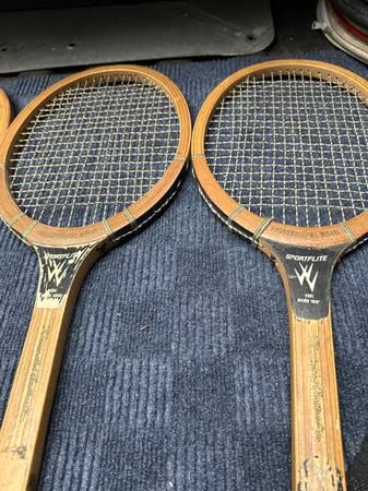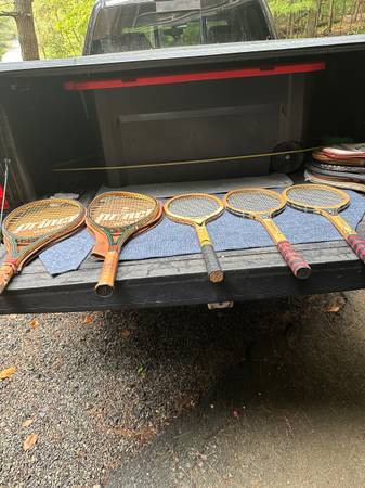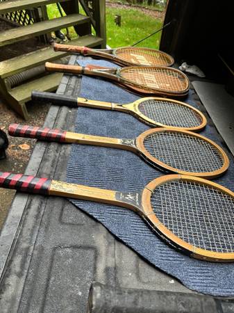 11-Total tennis 🎾 rackets. Some antique wooden ones. Some metal ones and some fiberglass ones. Some in great shape and some not. Most of them can be used. Some make nice wall hangers for decorating. Please look at the pictures. A couple of them have cases. $20.00 for all.