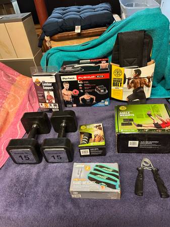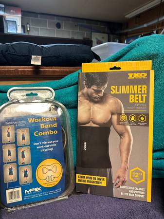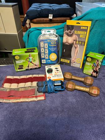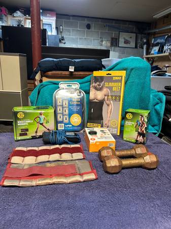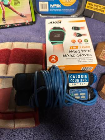 Golds gym new in box 5-pound pair wrist/ankle weights,3-pound pair weighted gloves. New in box TKO Slimmer belt. New in box Avia 1- pound weighted wrist gloves. Used slightly Powerhouse fitness workout band combo. Used 2-5-pound hand dumbbells. Used 2-2-or-3-pound ankle I think weights. Used calorie counting jump rope that needs battery and don’t know if it works to count calories but can be used as a jump rope. $30.00-for everything. Please look at all the pictures.