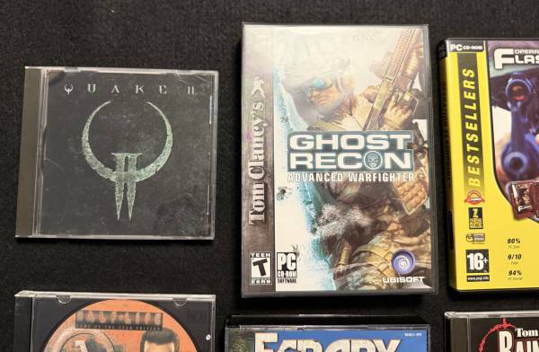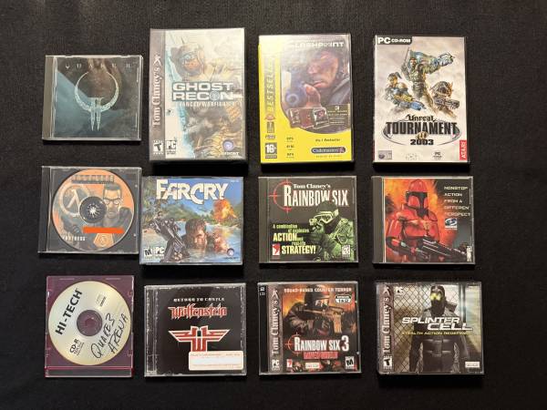 Selling my collection of first-person shooter PC Games. Includes: Quake 2 Ghost Recon: Advanced Warfare Operation Flashpoint Unreal Tournament 2003 Half-Life Fortress Far Cry Rainbow Six Quake 3...