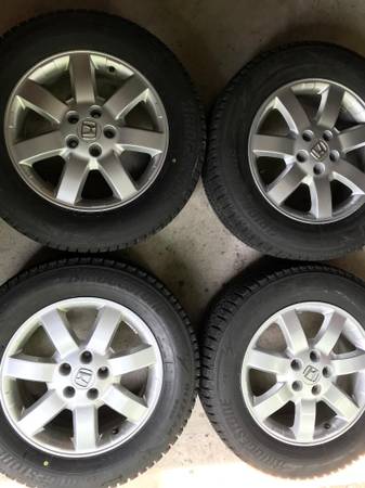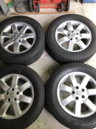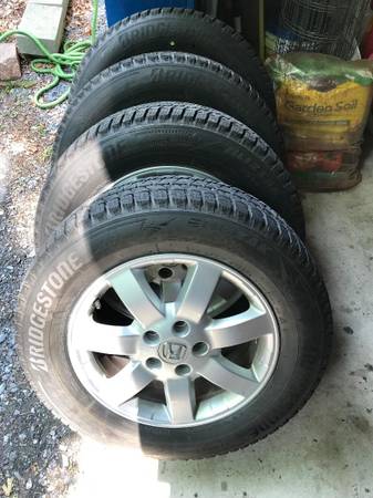 A hardly used set of 4 Bridgestone winter tires (225/65/17) mounted on Honda CRV wheels. Good for years 2007 - 2014. Tires perfectly balanced at COSTCO.