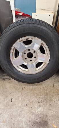 I HAVE (4) 265 70R17 BRIDGESTONE DUALER H/T TIRES MOUNTED ON 6 LUG GM WHEELS. SHOULD FIT NUMEROUS GM TRUCKS, PLEASE CHECK FOR YOUR APPLICATION. THEY WERE OFF A 2005 SUBURBAN. THEY WOULD MAKE GREAT WINTER TIRES AND WHEELS. THE RIMS ARE IN GOOD SHAPE HOWEVER CLEAR COAT IS STARTING TO PEEL AND AREN'T THAT PRETTY. SORRY NO CENTER CAPS $650.00 #2